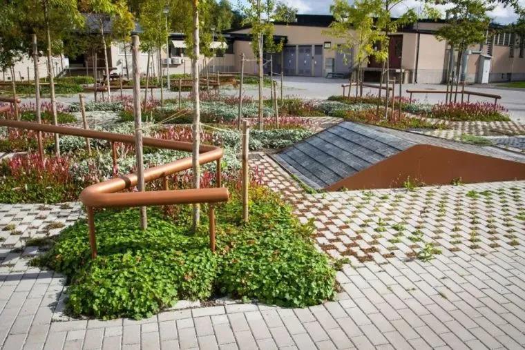 在軟硬鋪裝結合的基礎上,植物區與純鋪裝的阻攔部分采用銅色管狀阻隔物。銅色是溫暖的顏色,有利于