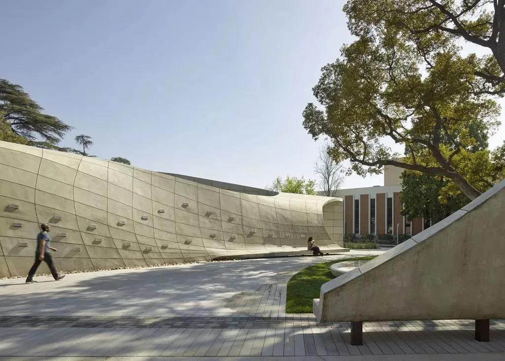 游客可以在樹蔭下呼吸新鮮空氣。在兩堵混凝土墻的表面安裝了75個領導的背光板,以突出該設施的許多