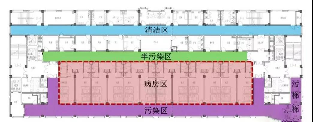 醫(yī)院四周為傳染病隔離區(qū),有30米-50米,集中于傳染病病人隔離區(qū)。為了降低感染風(fēng)險,住院樓醫(yī)院建筑平面被迫分為潔凈區(qū)、半污染區(qū)和污染區(qū)三個區(qū)域,每個區(qū)域都獨立分隔。采取不同的隔離措施和不同的布局為不同的功能室和不同的感染源。