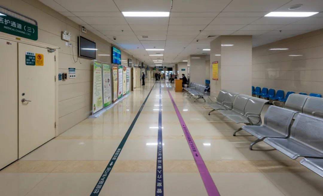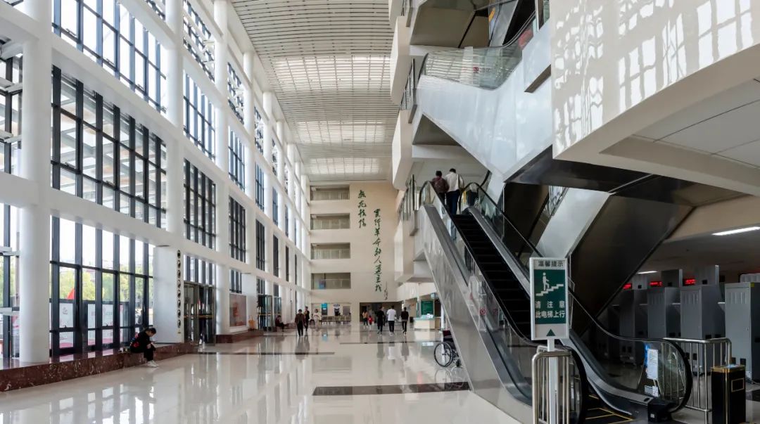 室內(nèi)的水平通道、垂直通道要從功能的分布、各醫(yī)療流程進(jìn)行梳理整合,選擇各種運(yùn)輸梯臺(tái)數(shù)量與形式,從而提高醫(yī)院的整體運(yùn)營效率。圖為上海市第六人民醫(yī)院門診醫(yī)技樓垂直電梯廳。