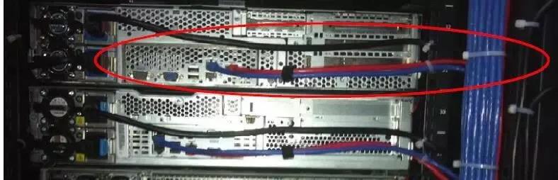 不同線纜用不同顏色的線區(qū)分,如內(nèi)網(wǎng)線:藍(lán)色,ILO線:灰色,電源線:黑色,預(yù)留的線纜長(zhǎng)度不宜過長(zhǎng),能從一側(cè)PDU到另外一側(cè)PDU即可,預(yù)留過長(zhǎng)線纜會(huì)對(duì)理線造成影響。上下兩臺(tái)服務(wù)器之間布線及捆綁要求如下圖:(因網(wǎng)線有電磁干擾,要做到強(qiáng)弱分開,電源線與網(wǎng)線要分開捆扎)